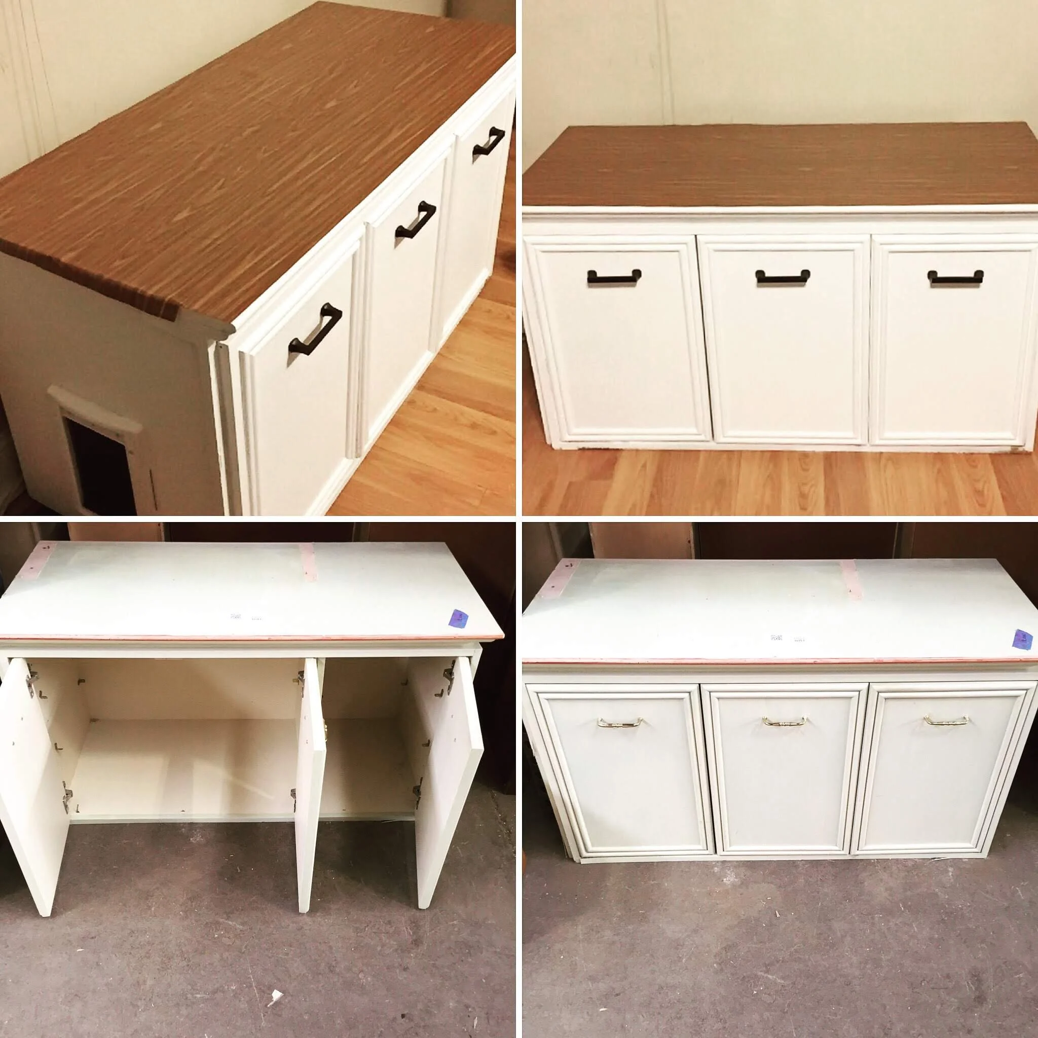 My husband and I took on this DIY back when we first started dating :). I found this old cabinet at Construction Junction and bought a pet door from the store. Matt helped cut and install the door along with painting and replacing the hardware on it.