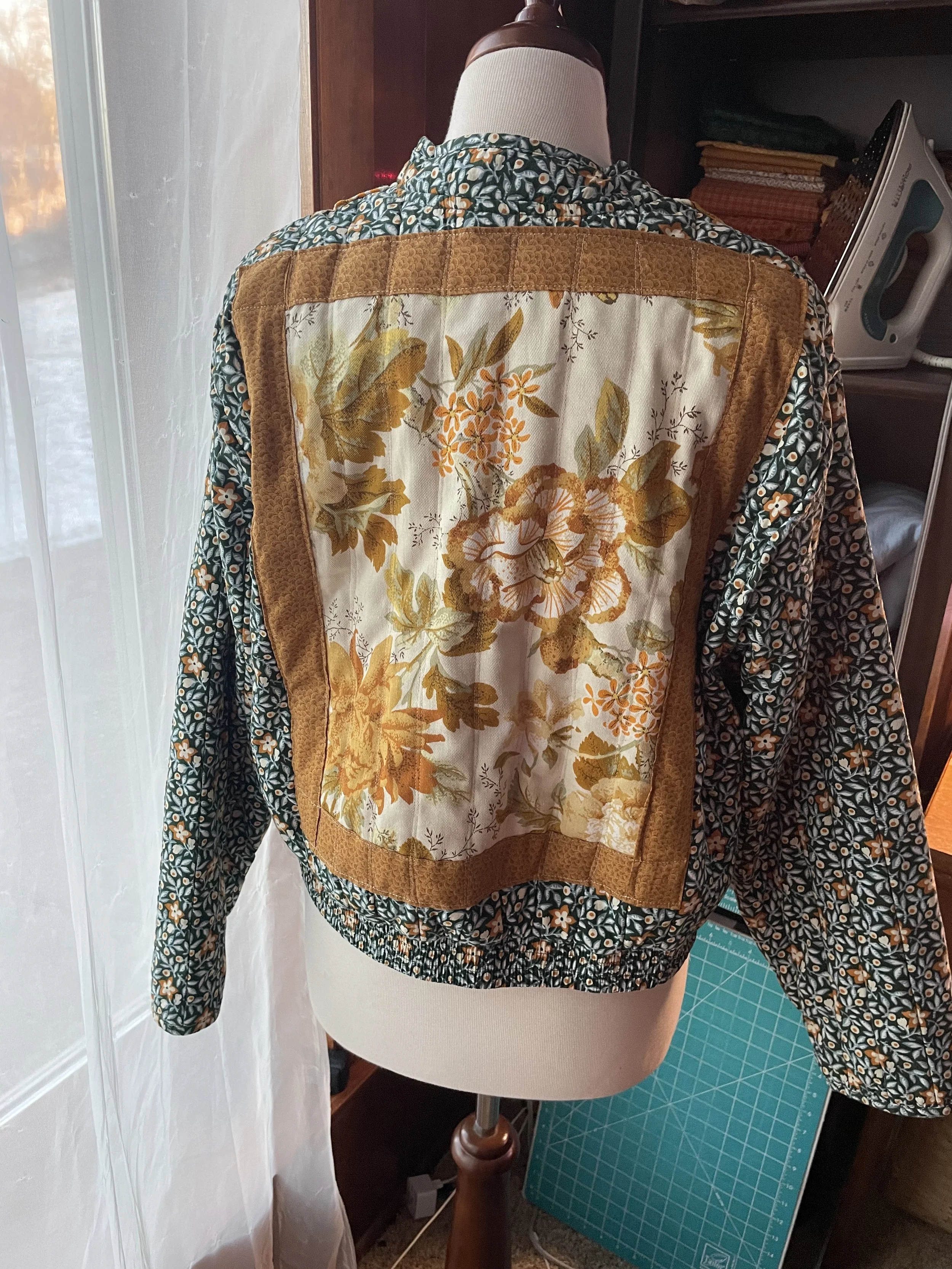 I thrifted this jacket (original is Universal Thread at Target) and then used my grandma’s fabric to cut out and sew on strips/patches to make a custom jacket for my sister Monica.
